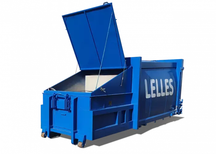 Den töms på plats av en komprimatorbil. Lock och sidoluckor kan låsas med hänglås.